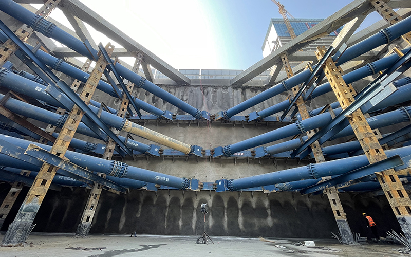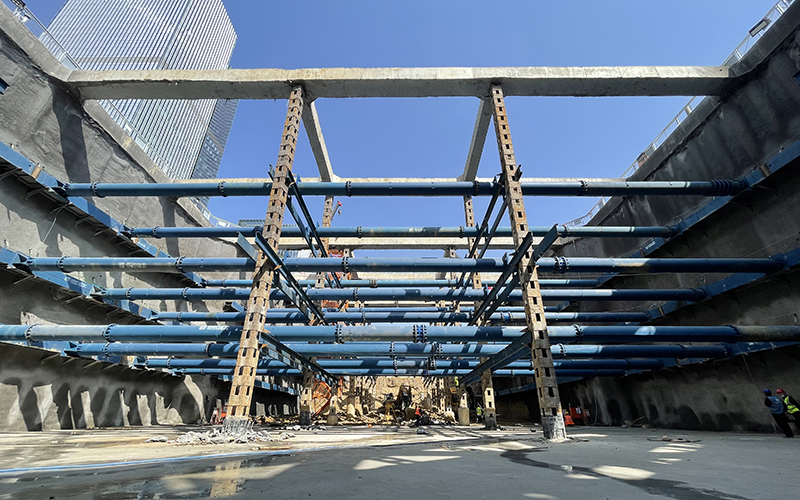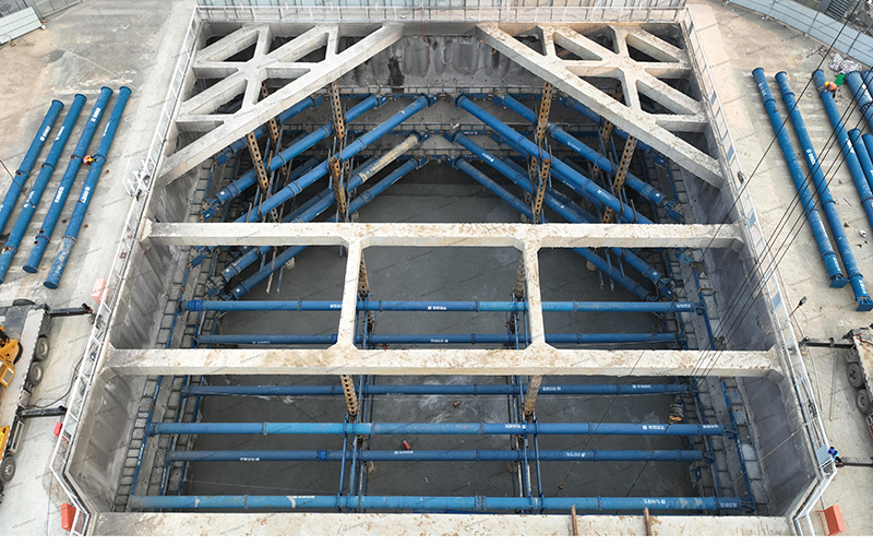 双层段基坑深度17m,纵向长度32m,横向长度33.8m。深基坑作业危险因素众多,为保障基坑安全开挖,项目在开挖前进行多次模拟推演,预估风险源并不断优化施工方案。开挖过程中遵循时空效应,采取“先撑后挖、水平分段、竖向分层”原则,做到“分层、分步、对称、平衡、限时”五个要点,双层下穿段土方量1.9万m³,经过连续作业4月16日完成基坑开挖并通过五方责任主体单位基坑验槽,4月19日完成垫层混凝土浇筑。