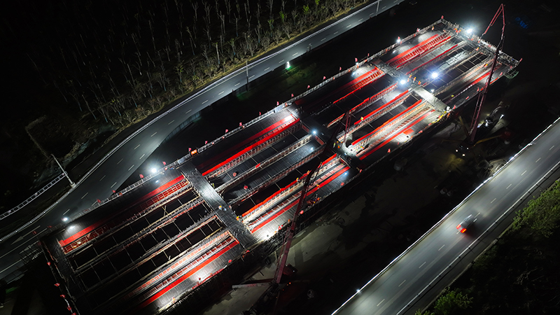 为保障首片现浇箱梁顺利浇筑,项目部严格按照品质工程的标准及要求,组织开展专家评审会,修改完善《现浇箱梁专项施工方案》,严把钢筋加工、模板验收、混凝土配合比设计工艺环节,并在浇筑前就生产、技术、质量、安全等进行了全方面交底。在浇筑过程中,项目负责人靠前指挥、掌控全局,技术人员规范操作,安全人员紧盯现场,排查安全隐患,每位建设者有条不紊,各司其职。