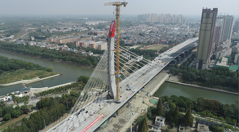 独塔斜拉桥为本项目控制性工程,主塔采用“主体立面为月形,下塔柱为圆形镂空”的混凝土塔,塔身高度近百米,塔西边次跨84米+塔东边主跨152米,主跨152米在老桥上面跨越店埠河,施工难度较大。自2021年8月22日主塔建设以来,项目管理人员克服施工技术难点,严把关键工序,应用变曲线钢筋分段预制、钢木组合模板、制作索导管精平定位装置等多项新技术,平稳快速推进施工进度。在项目部全体人员的共同努力下,完成主塔封顶,并实现国庆当天道路地面系统通车放行。预计年底完成全线建成通车任务,建设工期合理缩短了9个月。