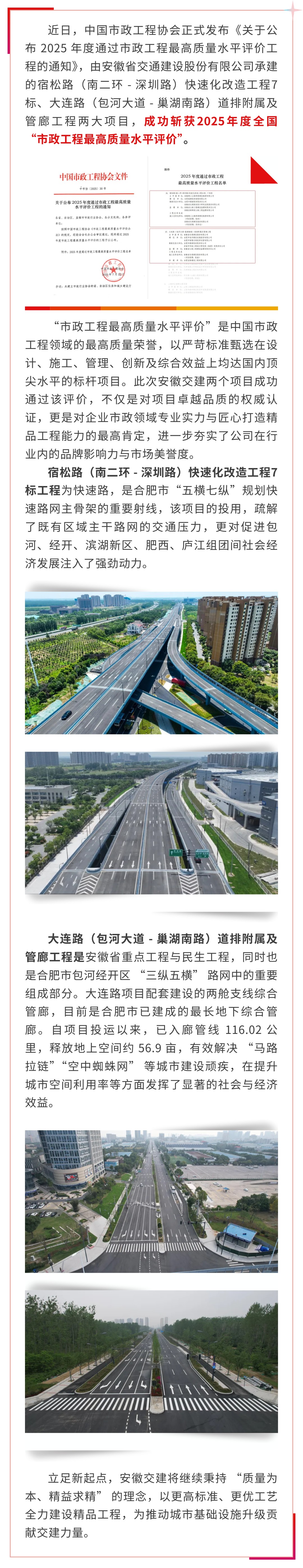 喜报!安徽交建两项目斩获2025年度市政工程最高质量水平评价