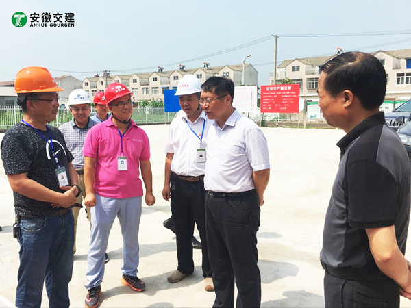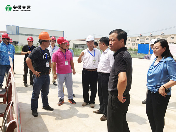 7月18日,安徽省交通控股集团总经理钱东升、建管处处长苏新国、项目办主任邹正明等领导一行莅临安徽交建滁淮高速定长段路面一标项目部进行检查指导。