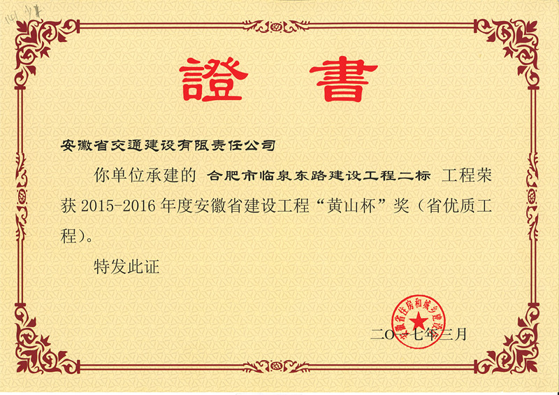安徽省建设工程“黄山杯”奖是安徽省建筑行业建设工程质量的最高荣誉奖,黄山杯的评选对象为安徽省建筑施工企业在中国境内承包、已经建成并投入使用的各类工程,工程质量标准需达到省内一流水平。安徽交建自成立以来,积极调整发展思路,不断加快市场开拓步伐,重点强化项目管理全过程控制,做好工程进度、质量、安全和现场文明施工管理,营造了良好的企业形象。